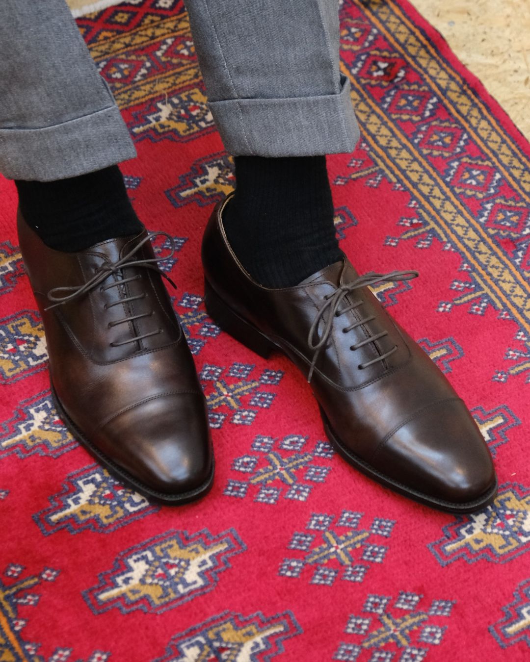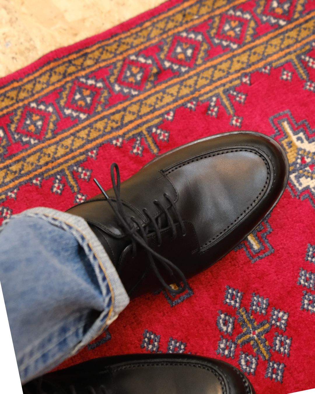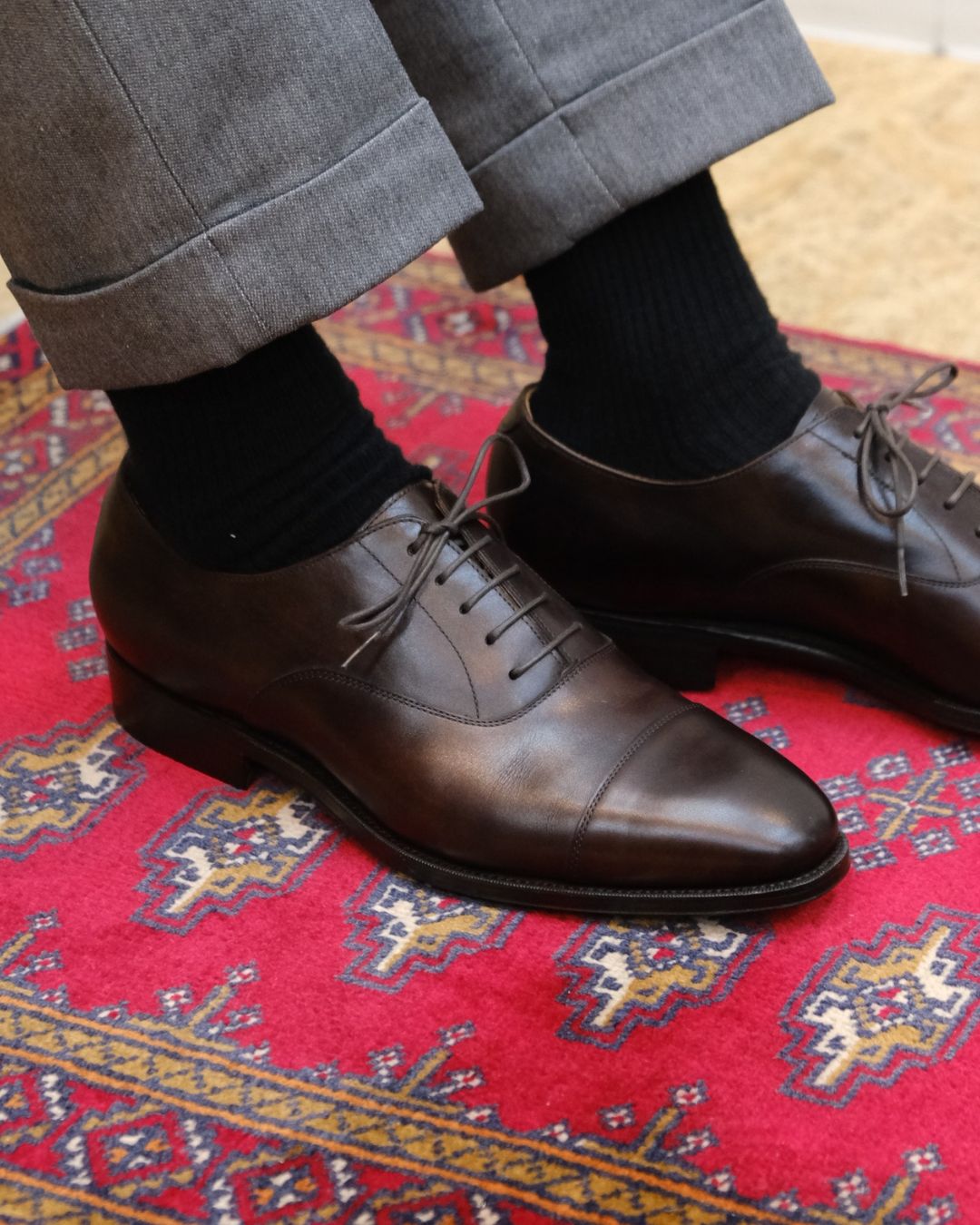 エレガントな佇まいのストレートチップですので、ラストのエレガントさと色気に合うように、ムラ染のボックスカーフを選定。