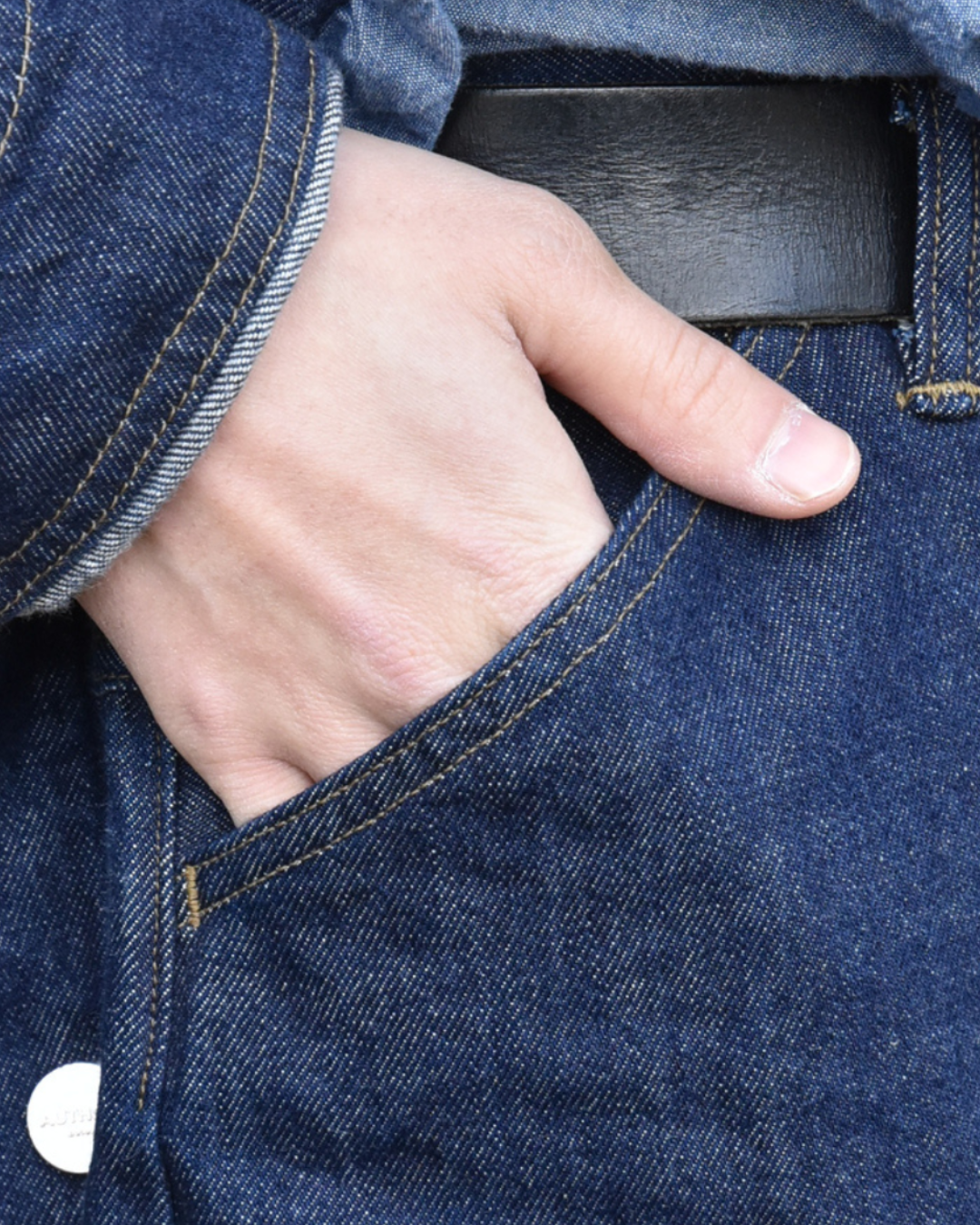 その他ディテールとしては、ボタンフライ、スラッシュカットされたフロントポケット、カンヌキ仕様のバックポケット。