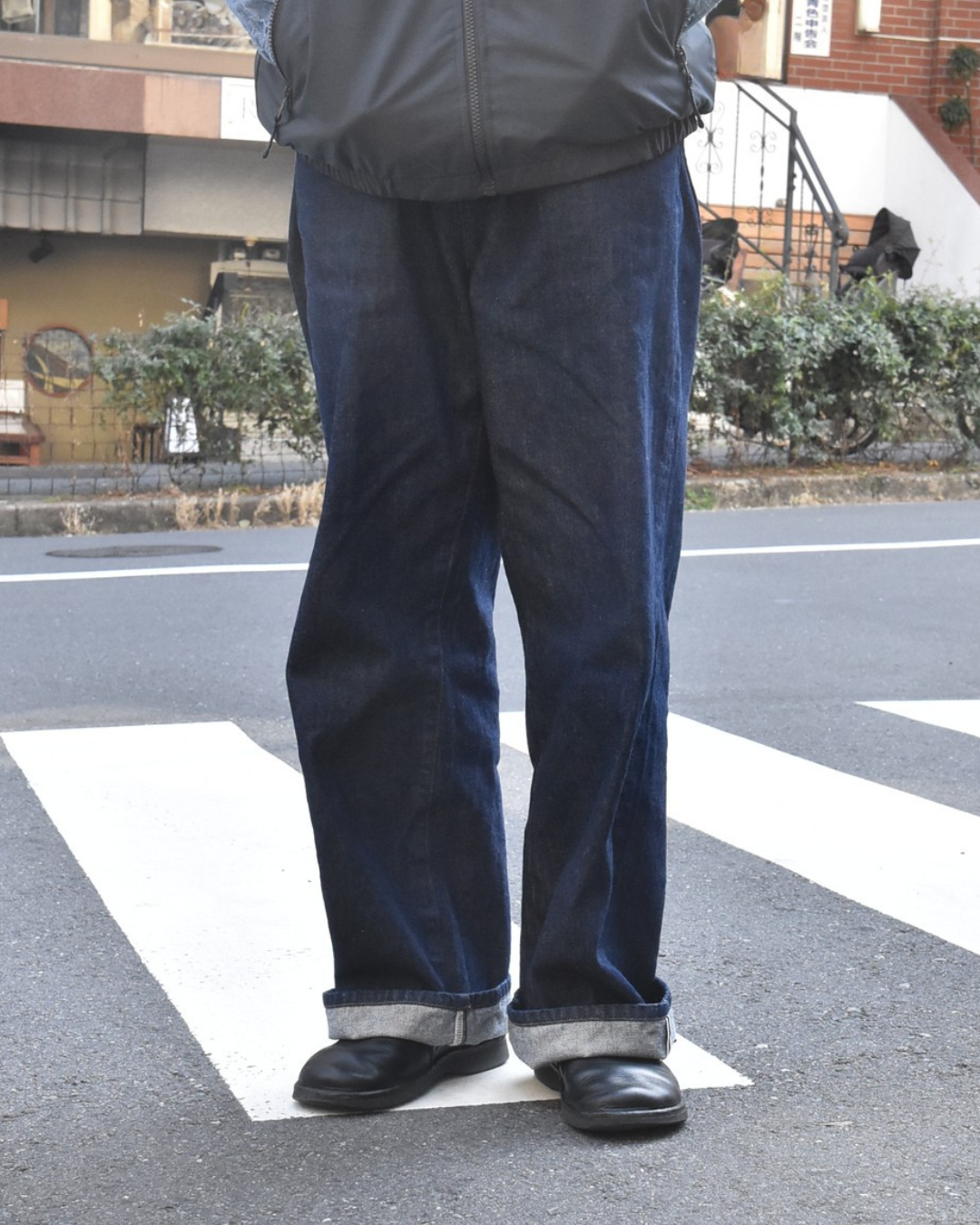 シルエットは先述の通りで太めのストレート。しかし、お尻周りがだぶつく作りではないこととフラットな生地感のおかげで野暮ったくなりません。