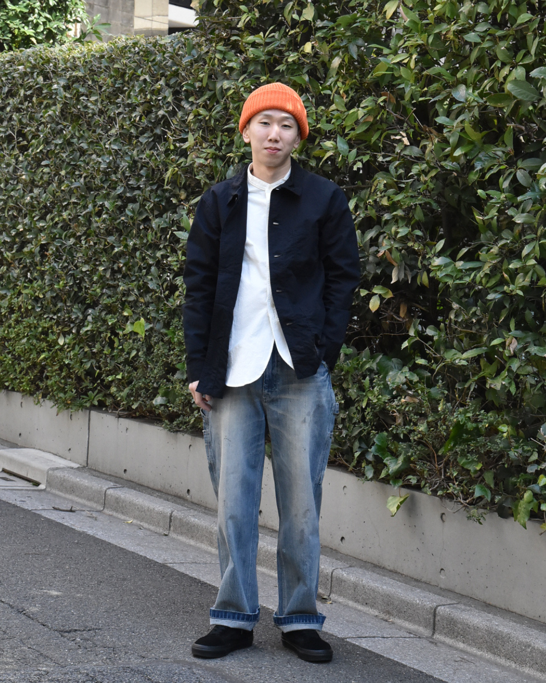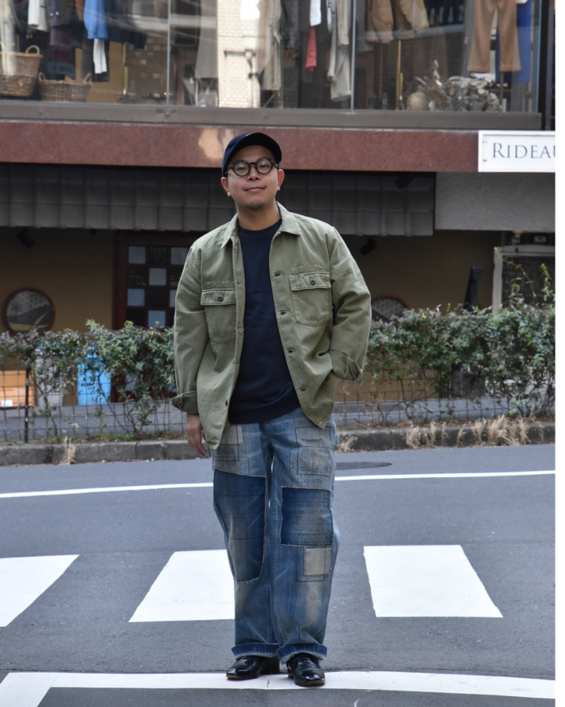 上をシンプルにシャツ、カバーオールとまとめたスタイルでも、パンツに雰囲気があるとしっかりまとまります。
