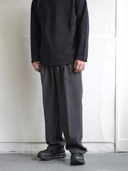 ウエストはバック部分がゴム仕様となっており、見た目はすっきりとしながらも快適な穿き心地。フロントにはタックが入り、センタークリースが綺麗に落ちることで、イージーパンツでありながら上品な印象を保っています。