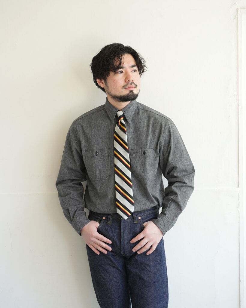 ワーク由来のラフなシャツに、あえてネクタイ。