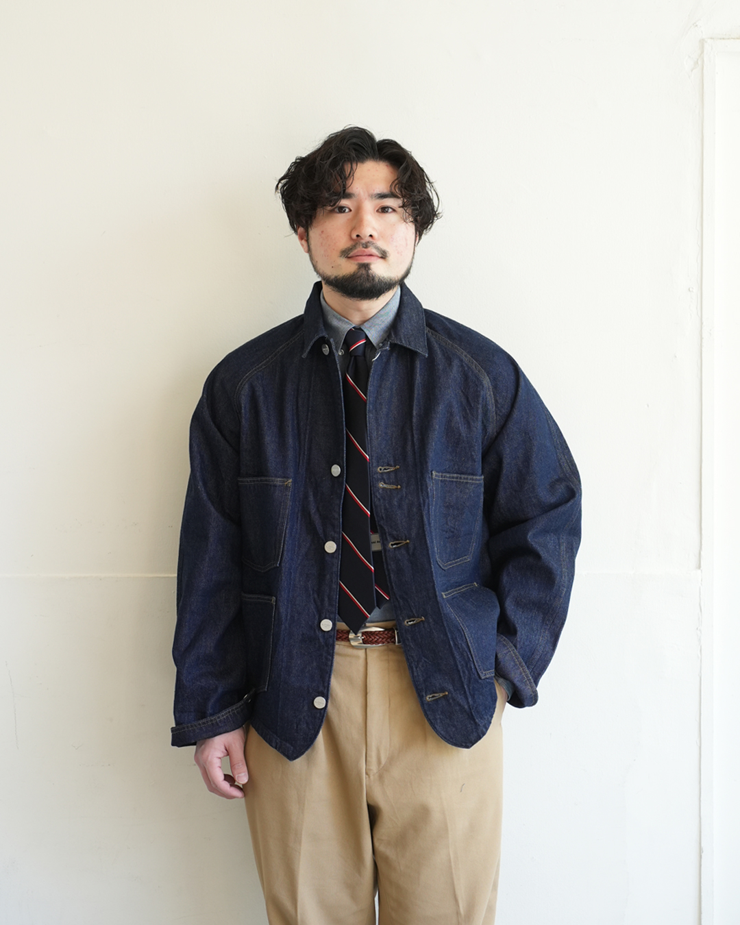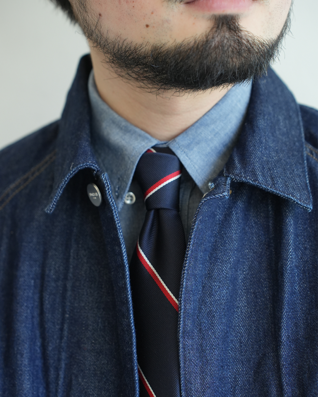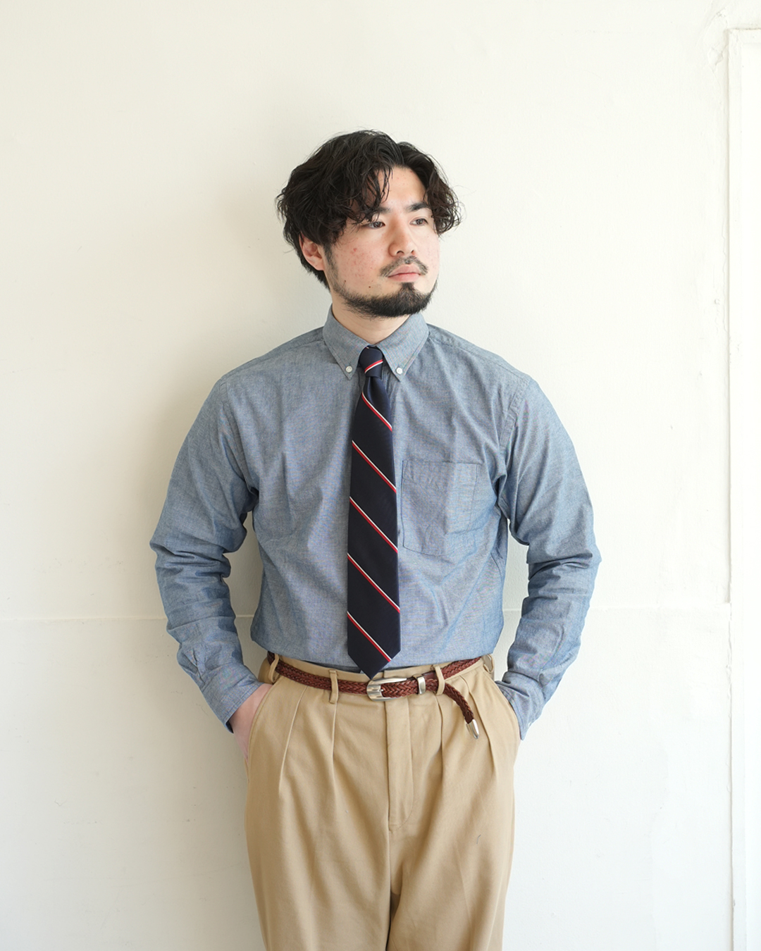 シャンブレーの生地も相まって、カッチリ感が出過ぎないのがポイント。