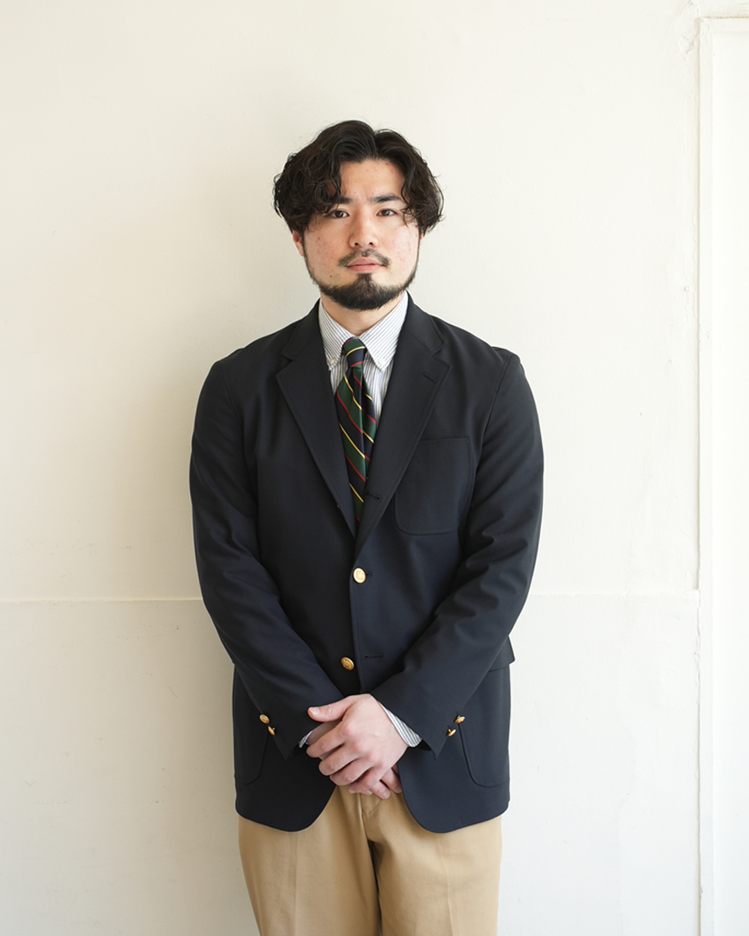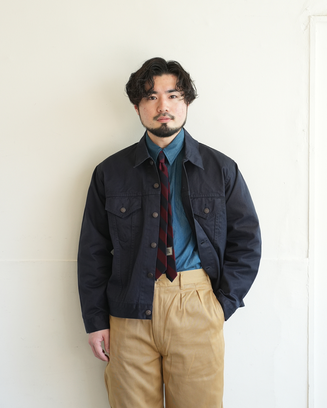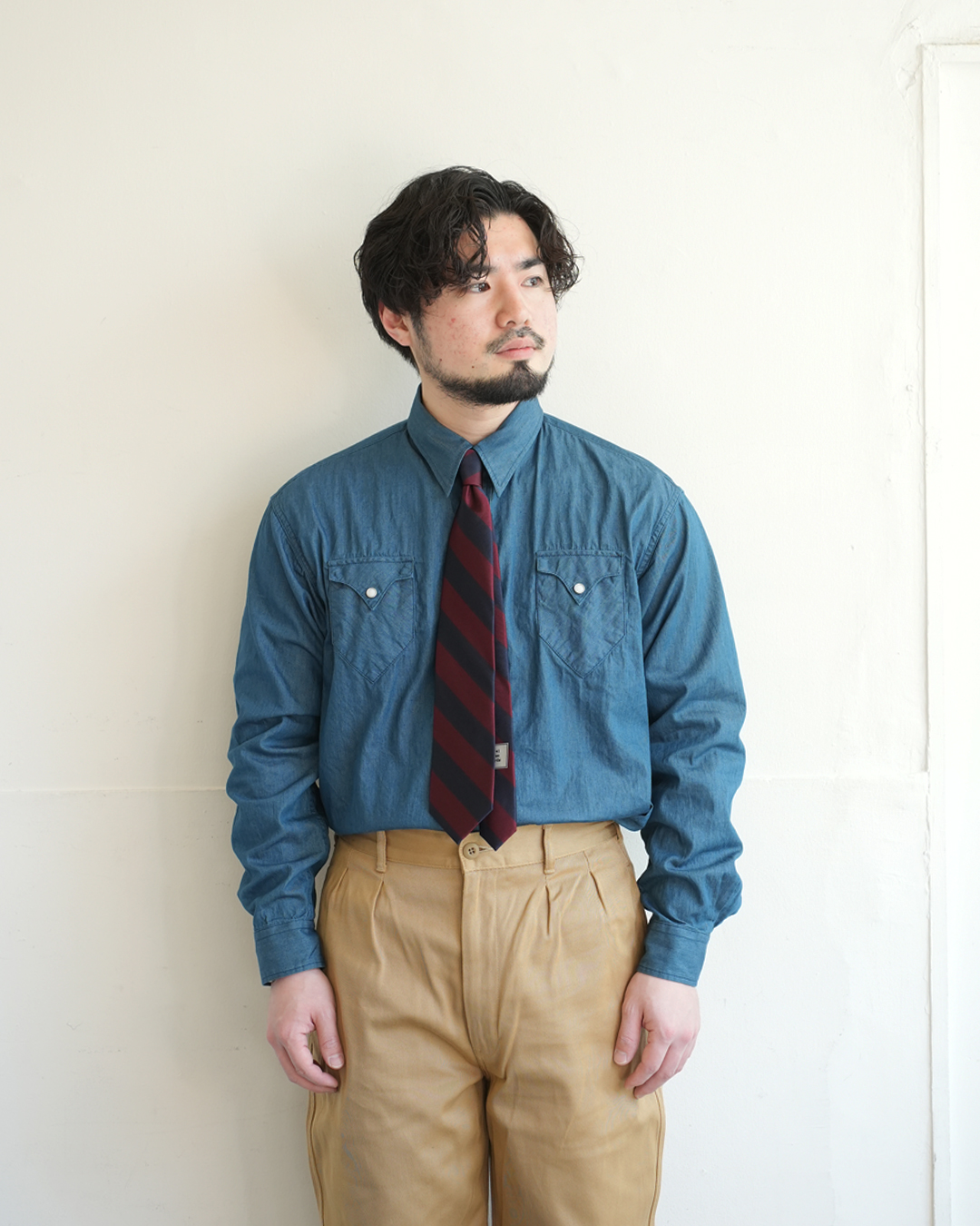 シャンブレーの生地も相まって、カッチリ感が出過ぎないのがポイント。