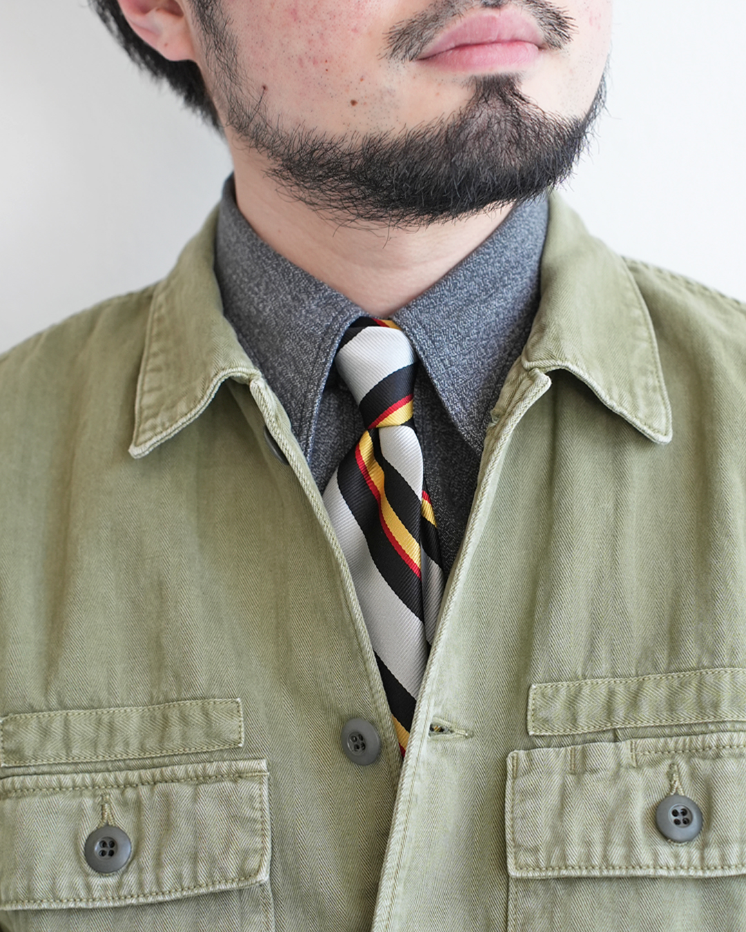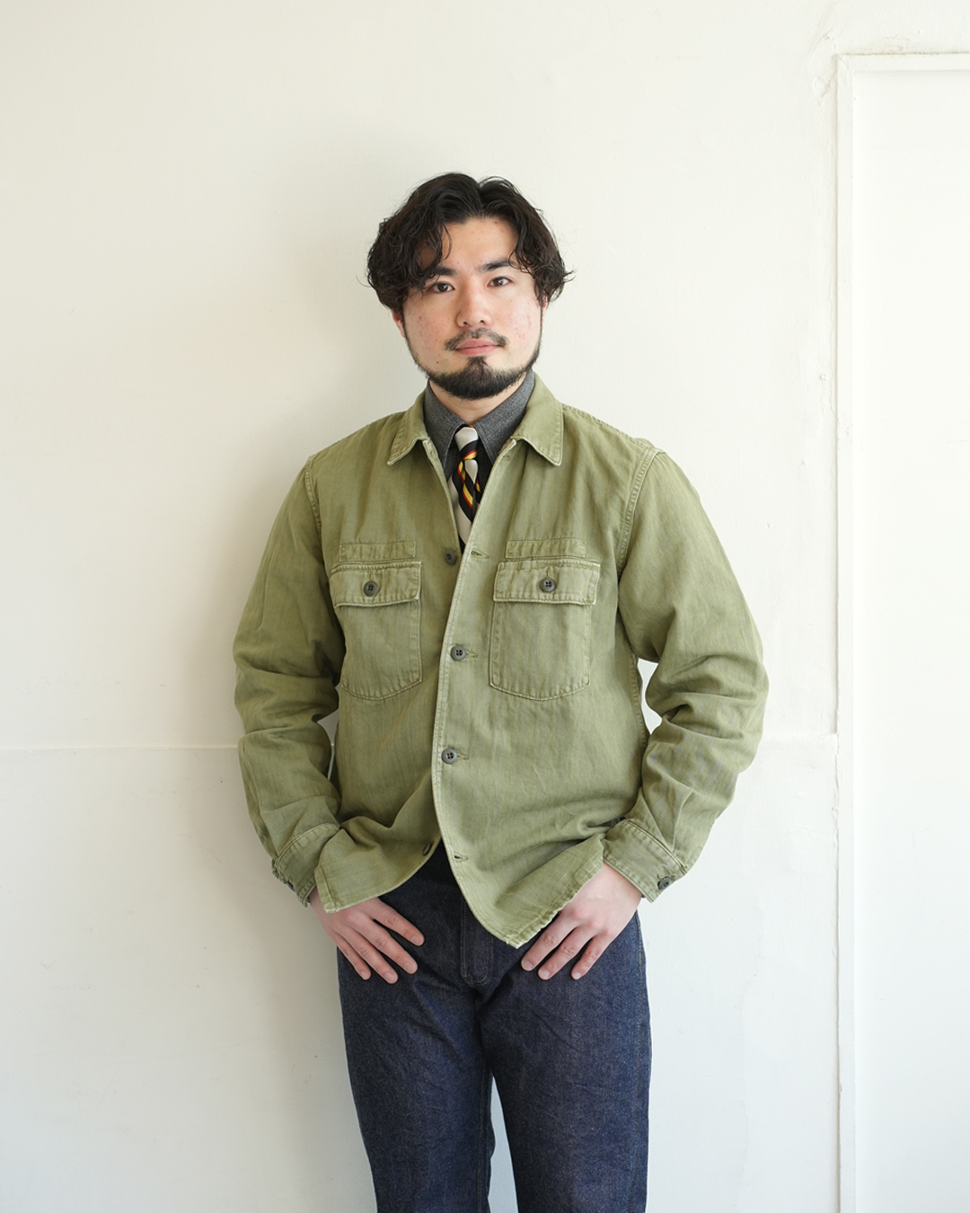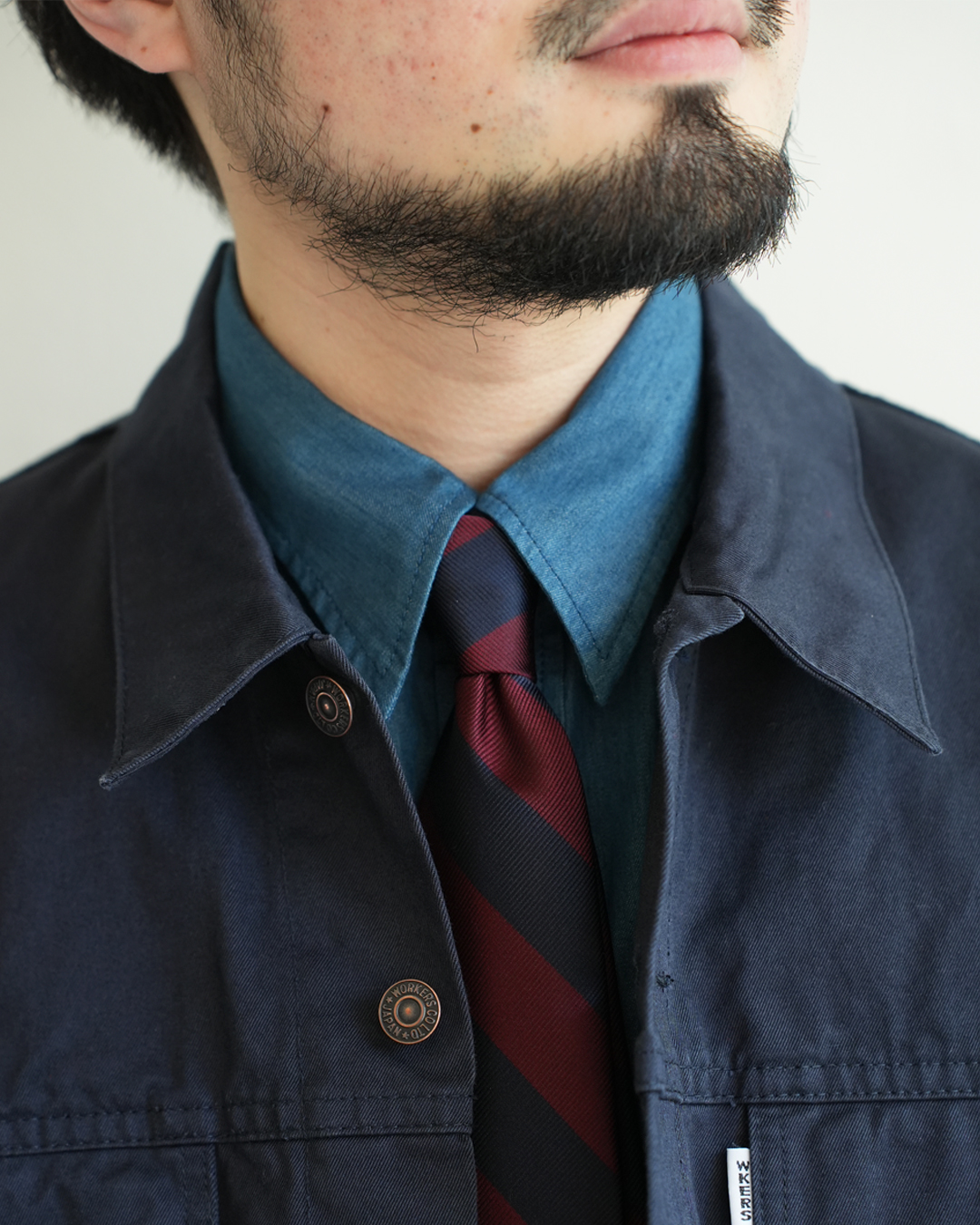 ワーク由来のラフなシャツに、あえてネクタイ。