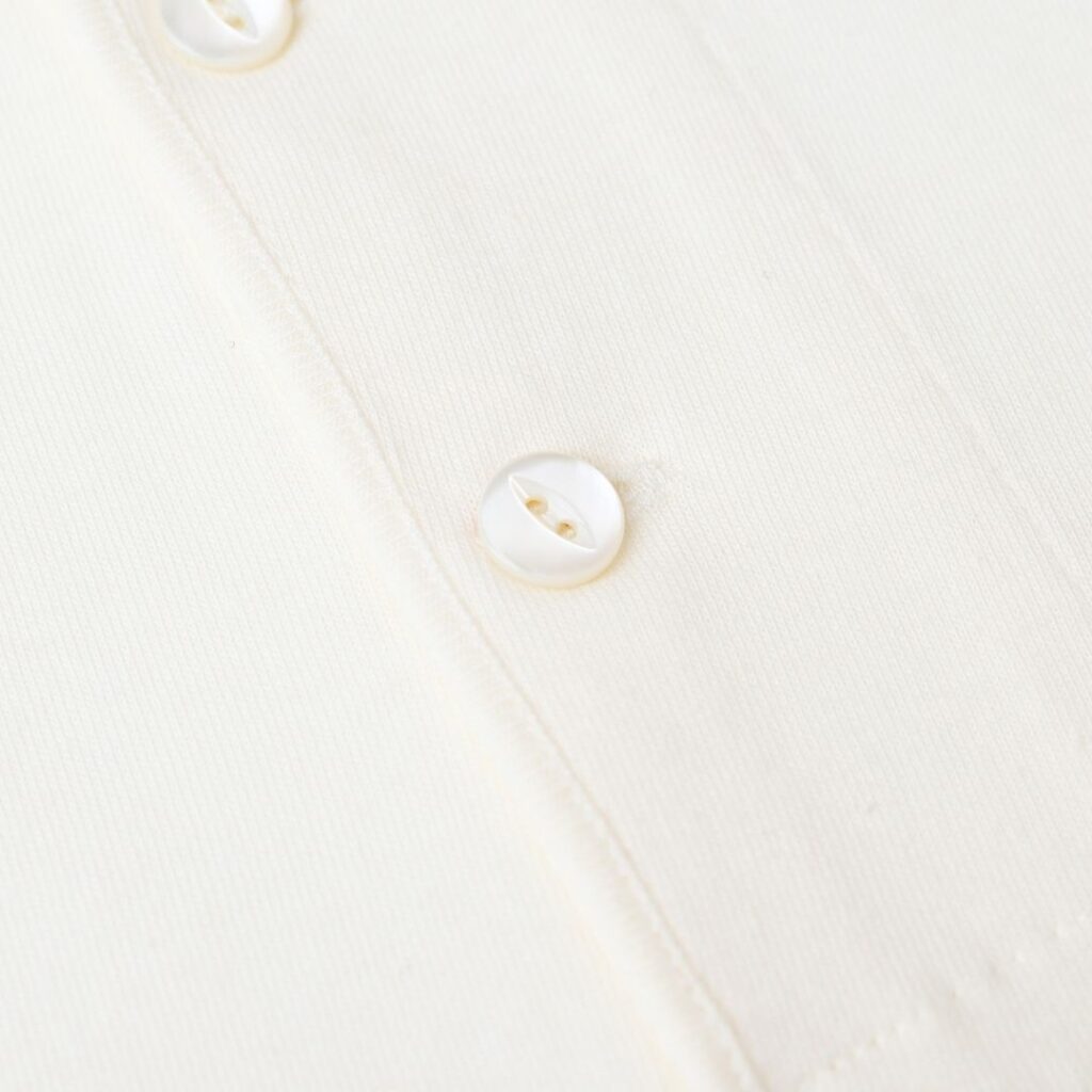 ボタンには軍用で見られる猫目釦をベースにしながら、一枚でも様になるよう貝釦を採用。