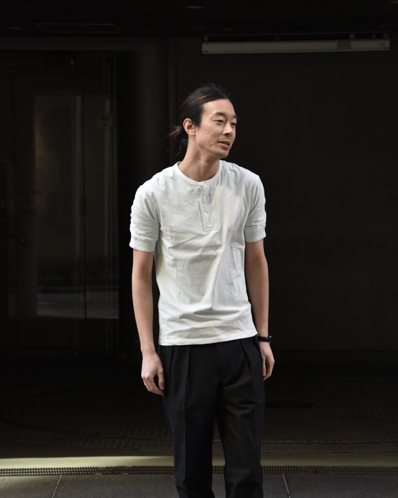 つまりヘンリーネックは、元来“見せるための服”ではなく、身体の内側に寄り添う衣服でした。