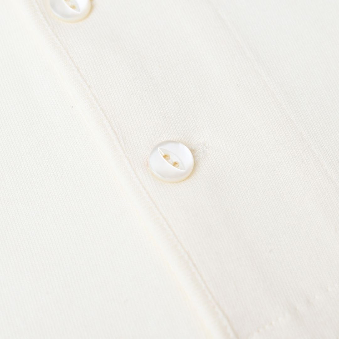 ボタンには軍用で見られる猫目釦をベースにしながら、一枚でも様になるよう貝釦を採用。