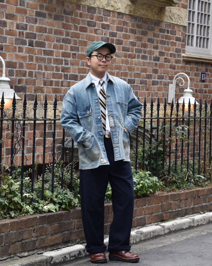 BDシャツにレジメンタルをしっかり閉めて、ガサっとカバーオールを羽織る。かっこいいじゃあないですか。