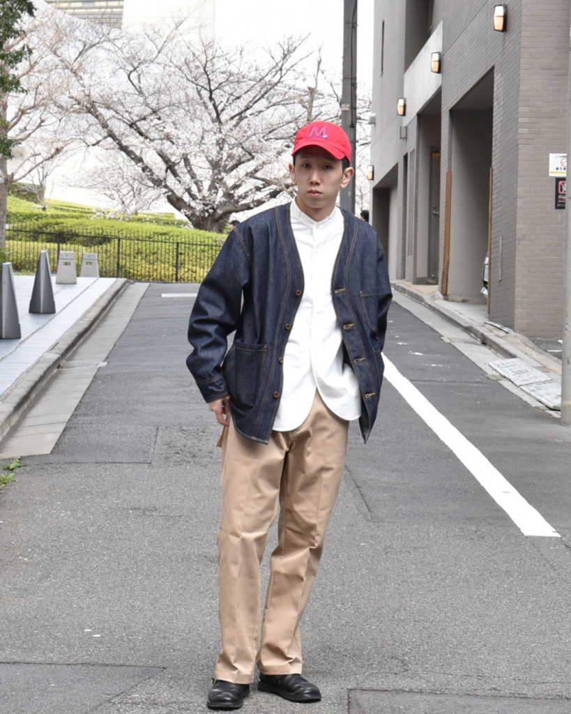 カバーオールらしい要素、こだわりのボタンや生地感がありながらもファッションとして着やすい形に落とし込まれています。