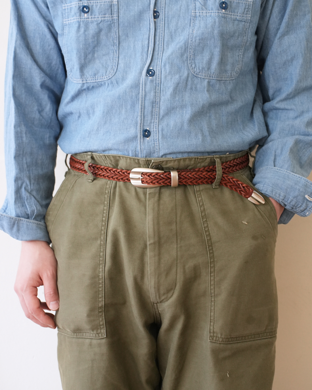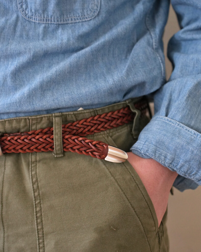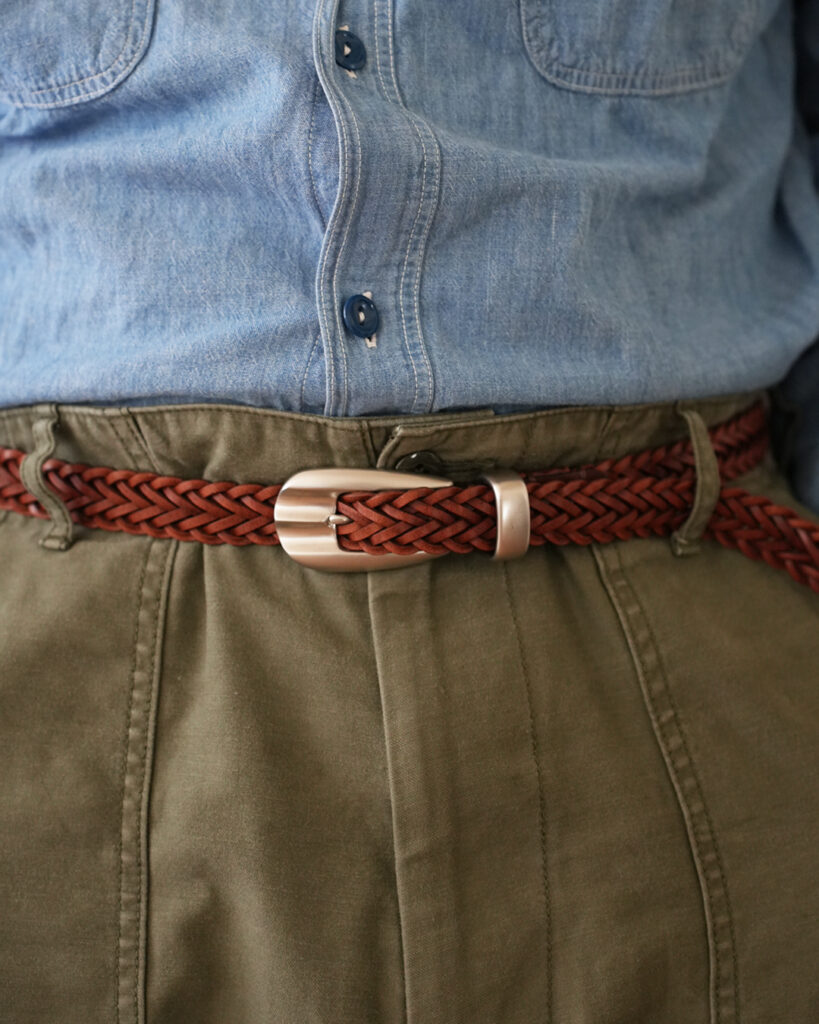 2cm幅と通常よりも細めのベルトですので、軍パンなどのカジュアルパンツからスラックスまでと、ジャンルレスで合わせられる1本だと思います。