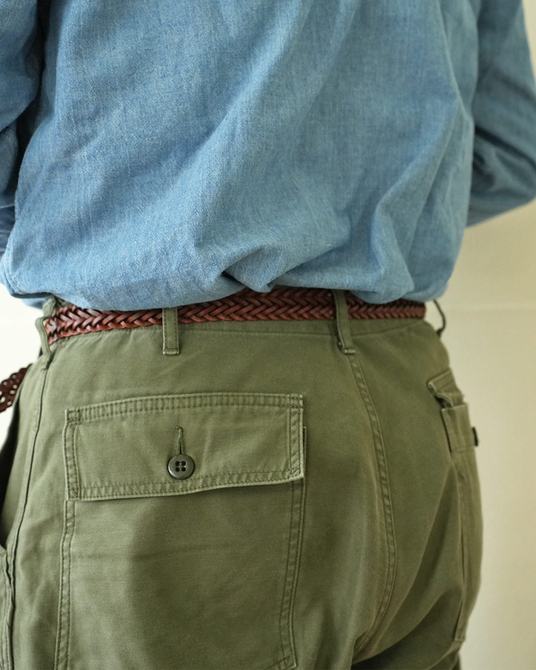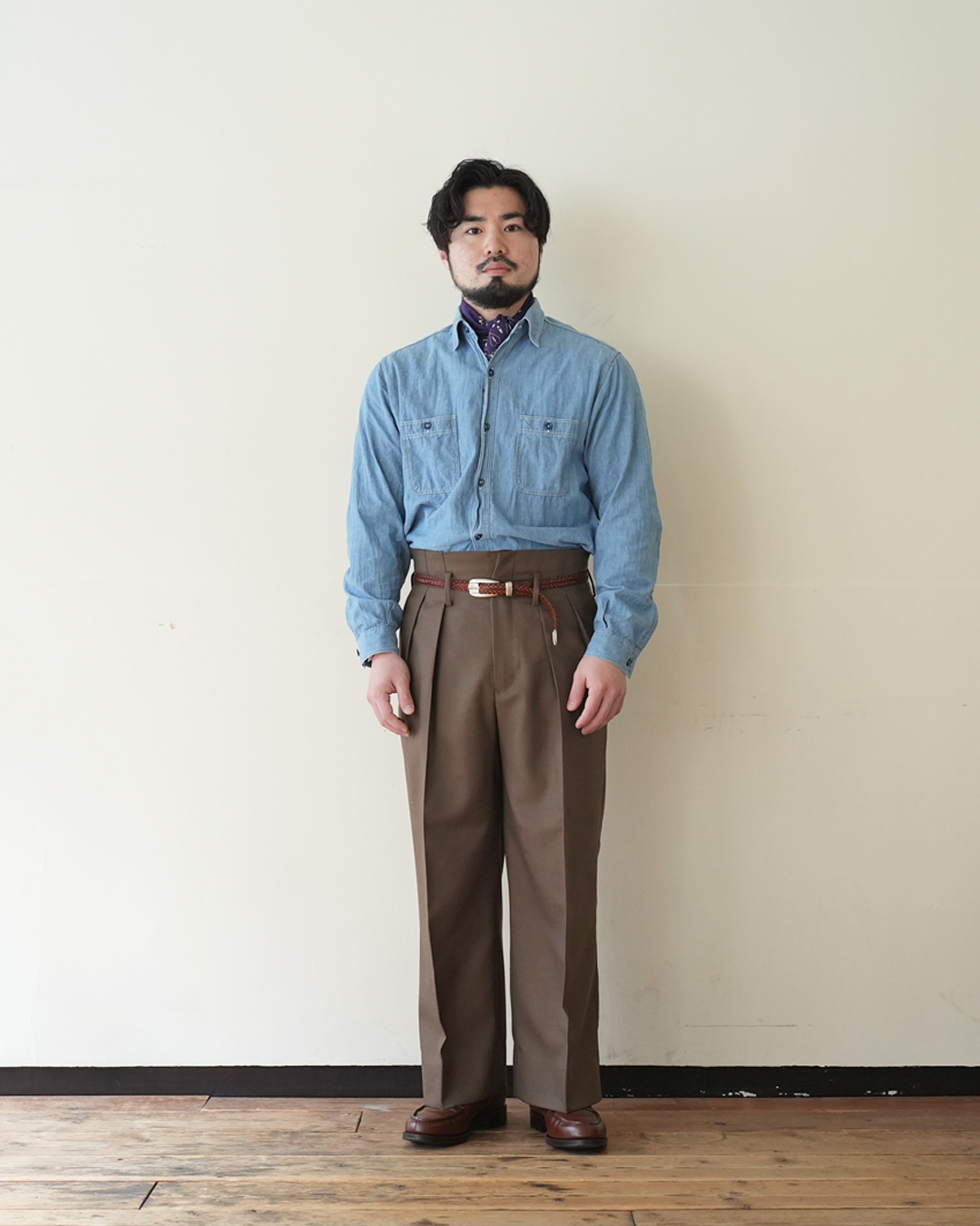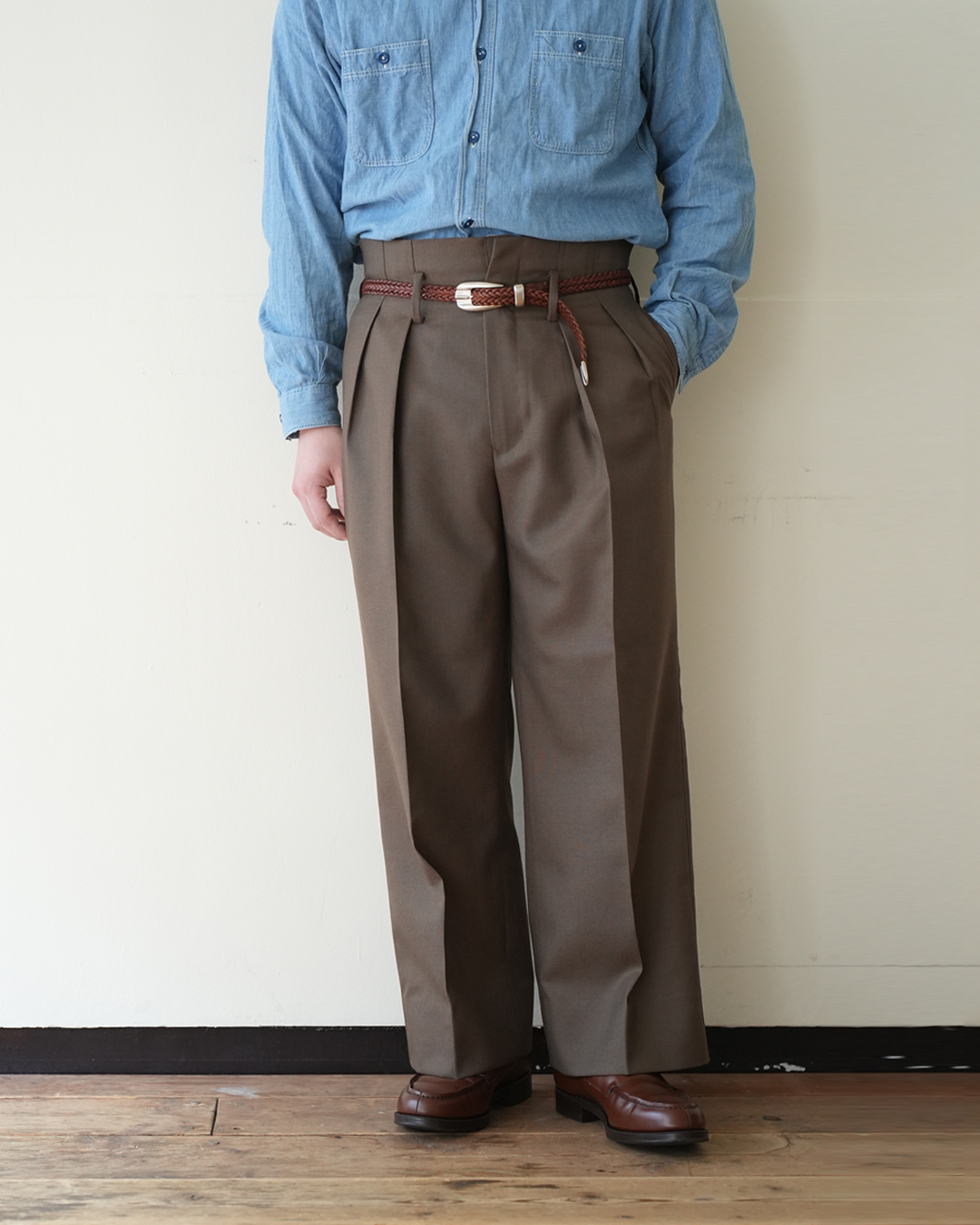 2cm幅と通常よりも細めのベルトですので、軍パンなどのカジュアルパンツからスラックスまでと、ジャンルレスで合わせられる1本だと思います。