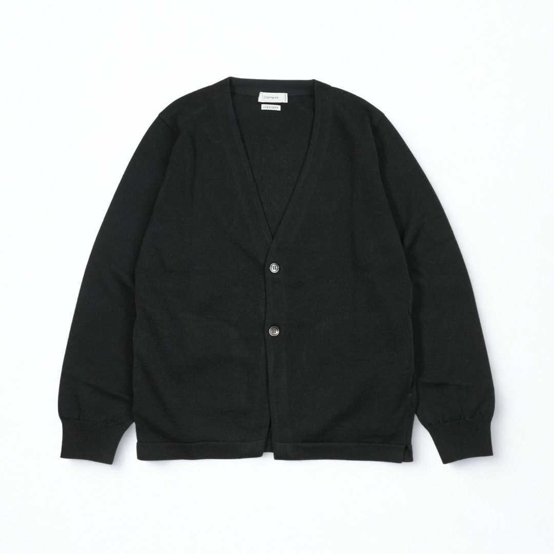 カーディガンとノーカラージャケット、その中間に位置するようなデザインが特徴の一着です。