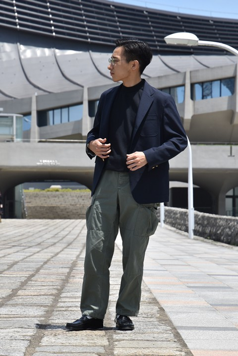 デニムよりも分かりやすくカジュアルに見せてくれるので、カッチリさせ過ぎたくない時に重宝する組み合わせです。