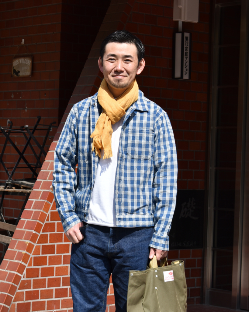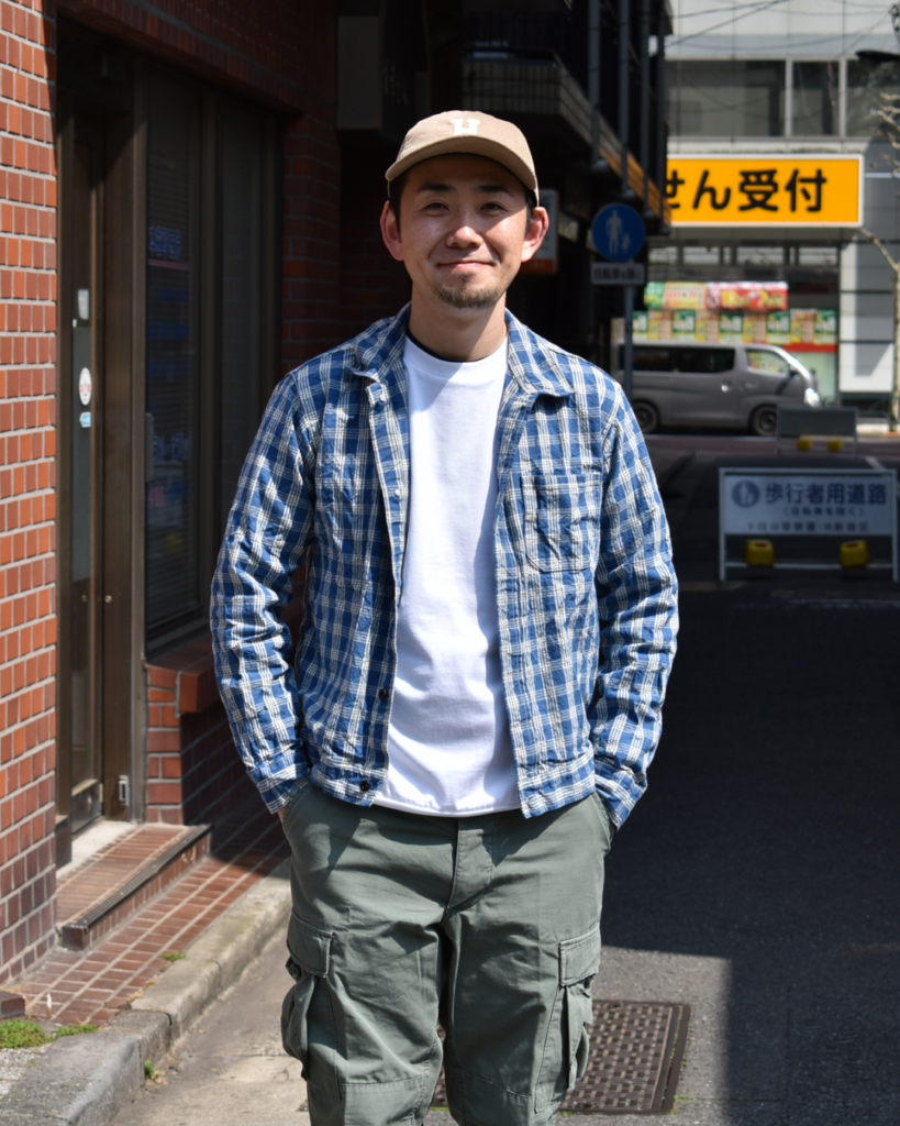 インナーにはTシャツやカットソーを合わせる前提でのサイズ感。ボタンを閉めて着ることもないかと思います。もしスウェットも合わせる想定ならばMだとタイトなのでLサイズですね。