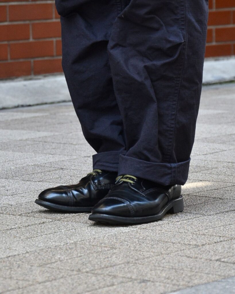 A3.いつものスタイルでも、少しちゃんと見せたたい時に履きます。黒の革靴って履くだけで締まってシュッとみえるのでカジュアルアップには持って来いですね。スラックス系にも合いますが、軍靴が由来ですのでカーゴやファティーグとも相性良いと思います。