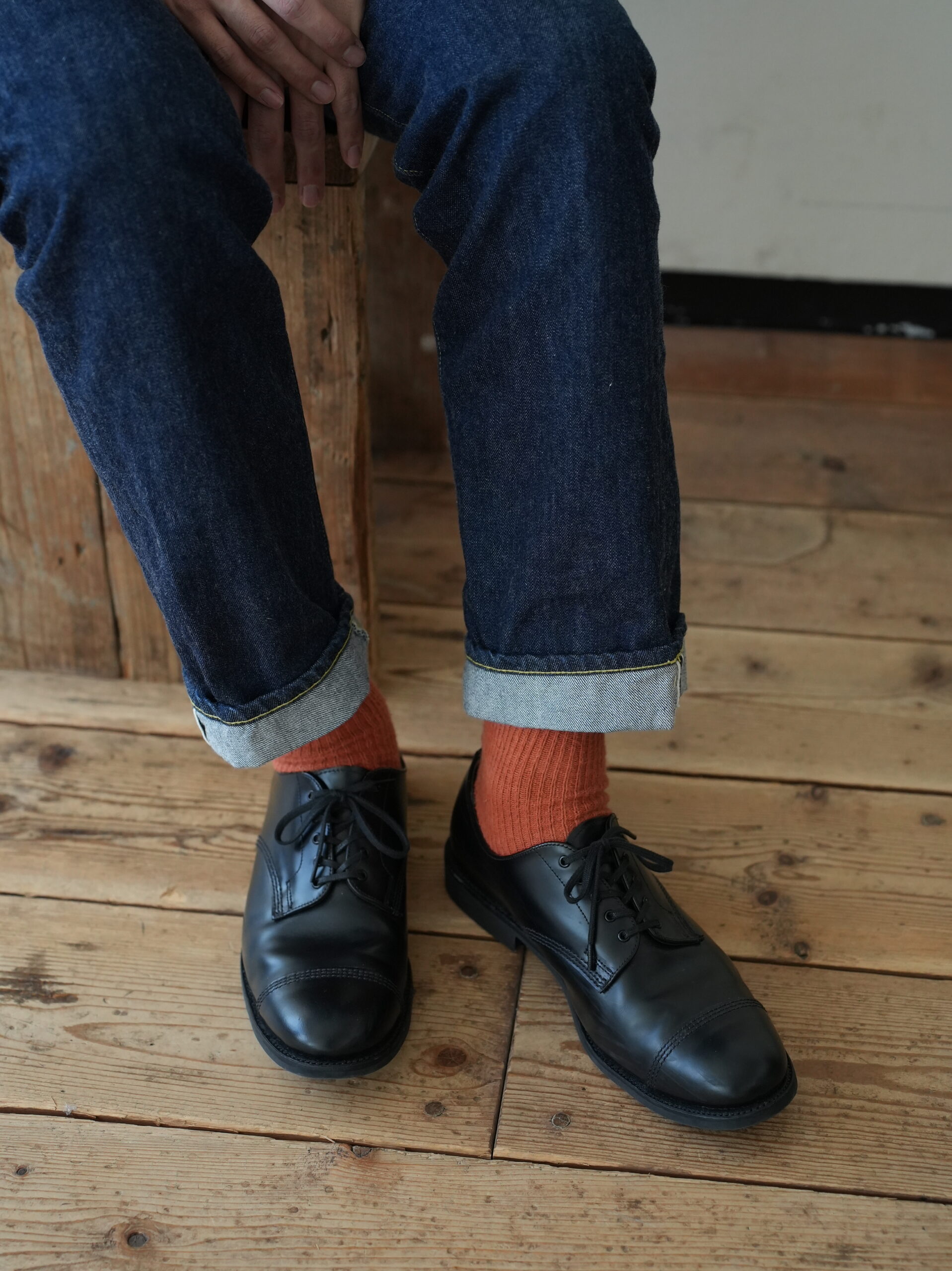 ●A2.足のサイズ26cmでUK6.5を着用しております。革靴用の薄手の靴下がメインだったらUK6でも着用可能ですが、日頃からカジュアルなスタイルが多いので靴下もカジュアルなパイルソックスなどが合わせられるように少しゆとりのあるサイズ選びにしております。