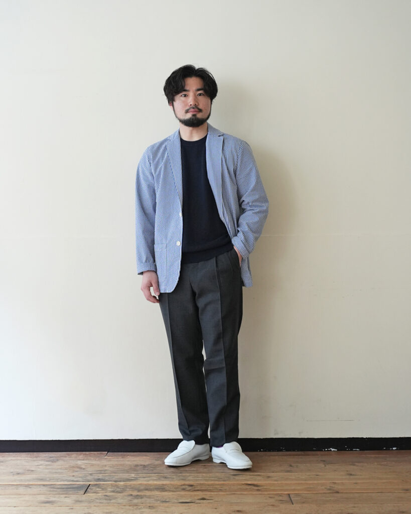 夏らしくシアサッカーのジャケットにリネンニットを合わせた夏らしいスタイリングなんていかがでしょう。