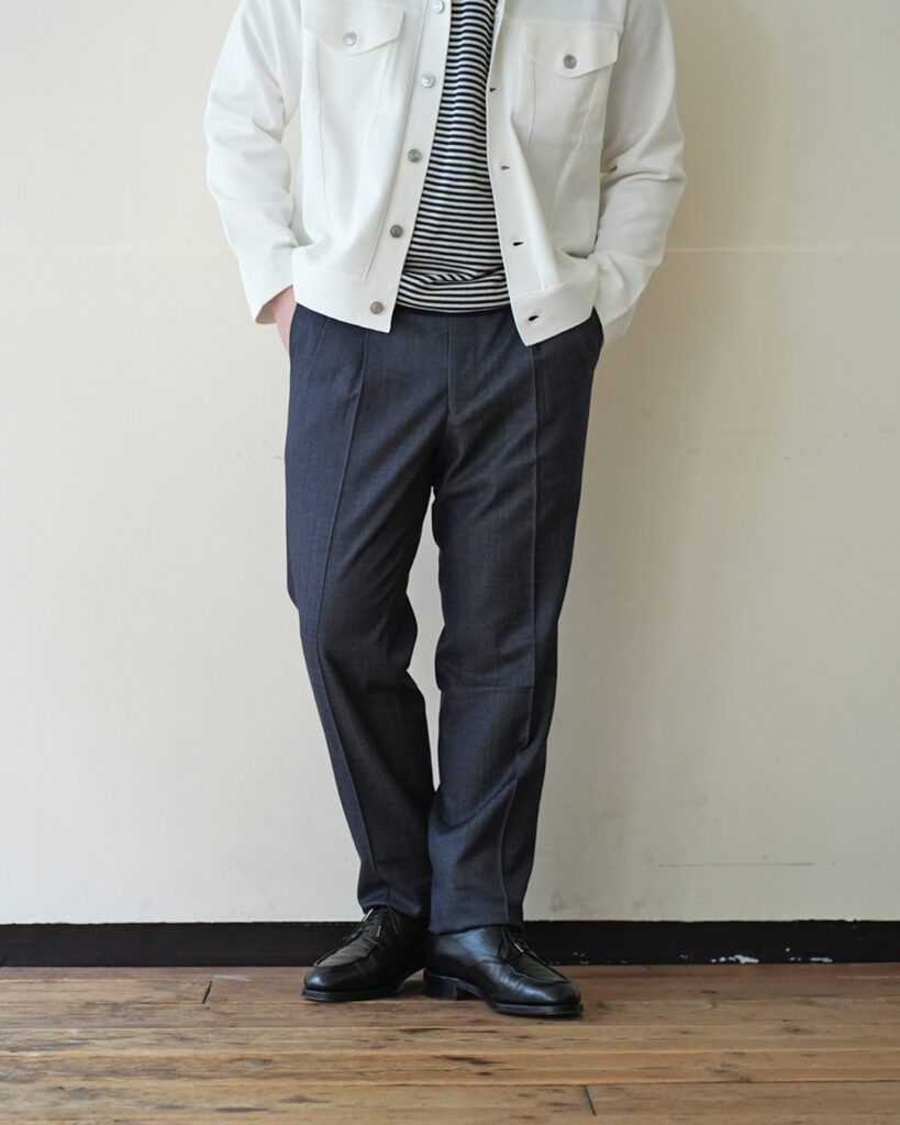 私自身、このオサクシリーズを穿いてみて感じる事はコットンでもウールでもハリコシのある素材を使用しているので裾に向かって落ちるラインがものすごく綺麗だという事。