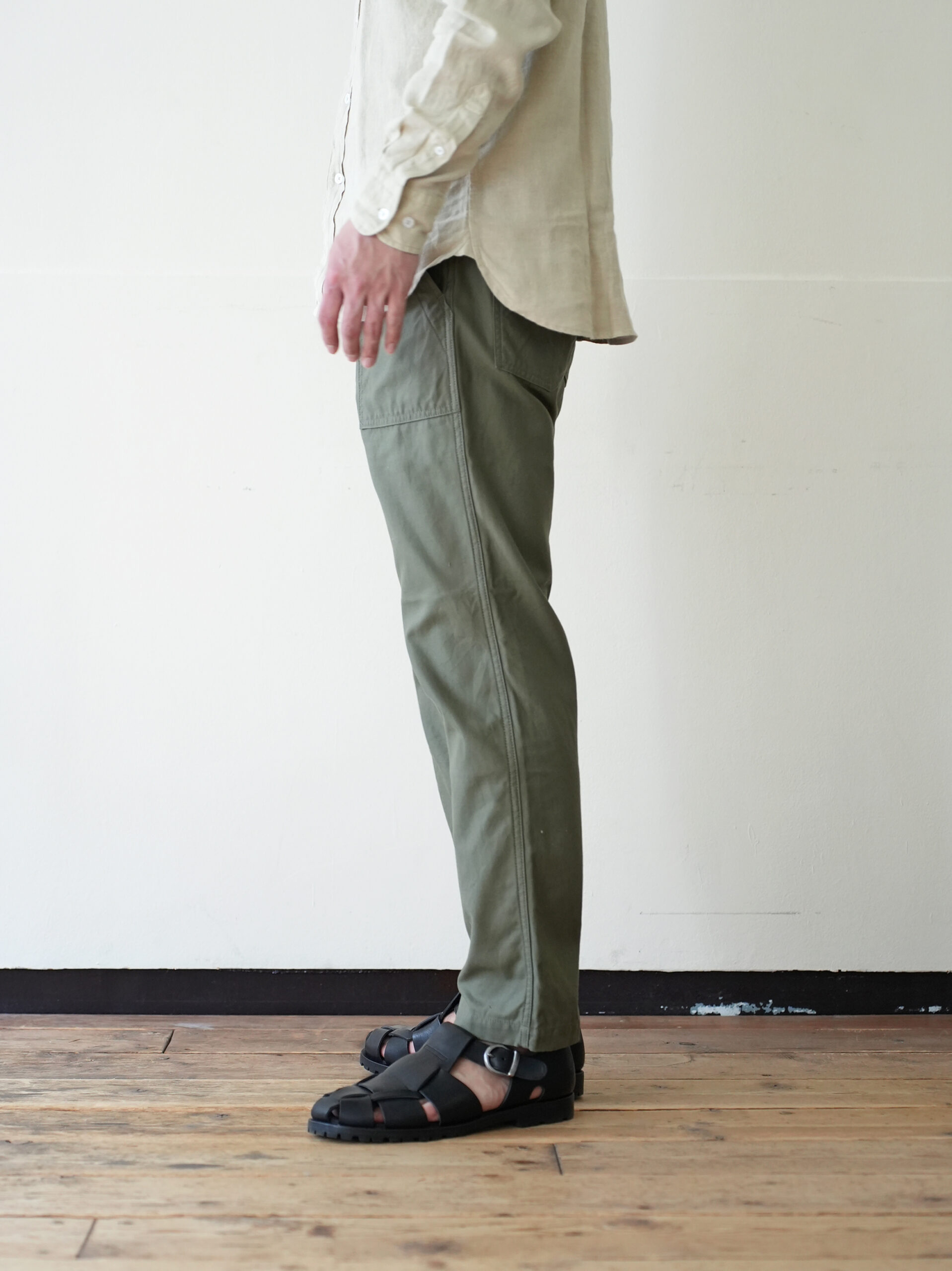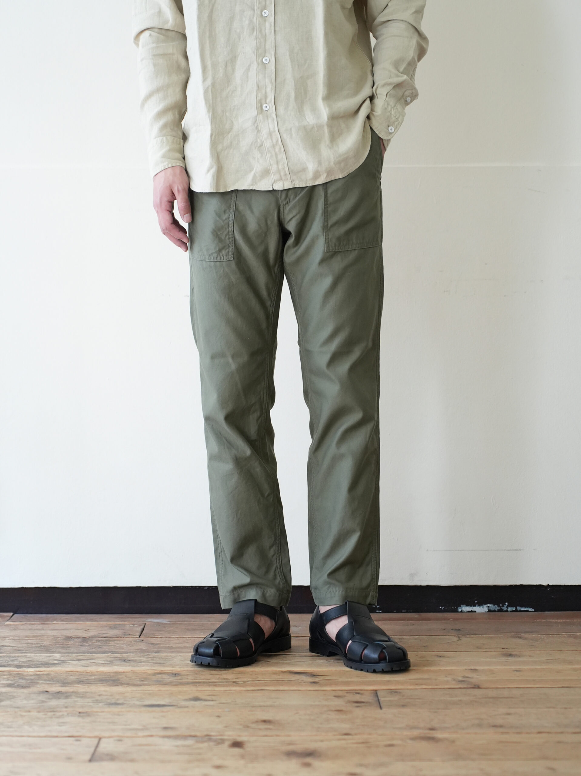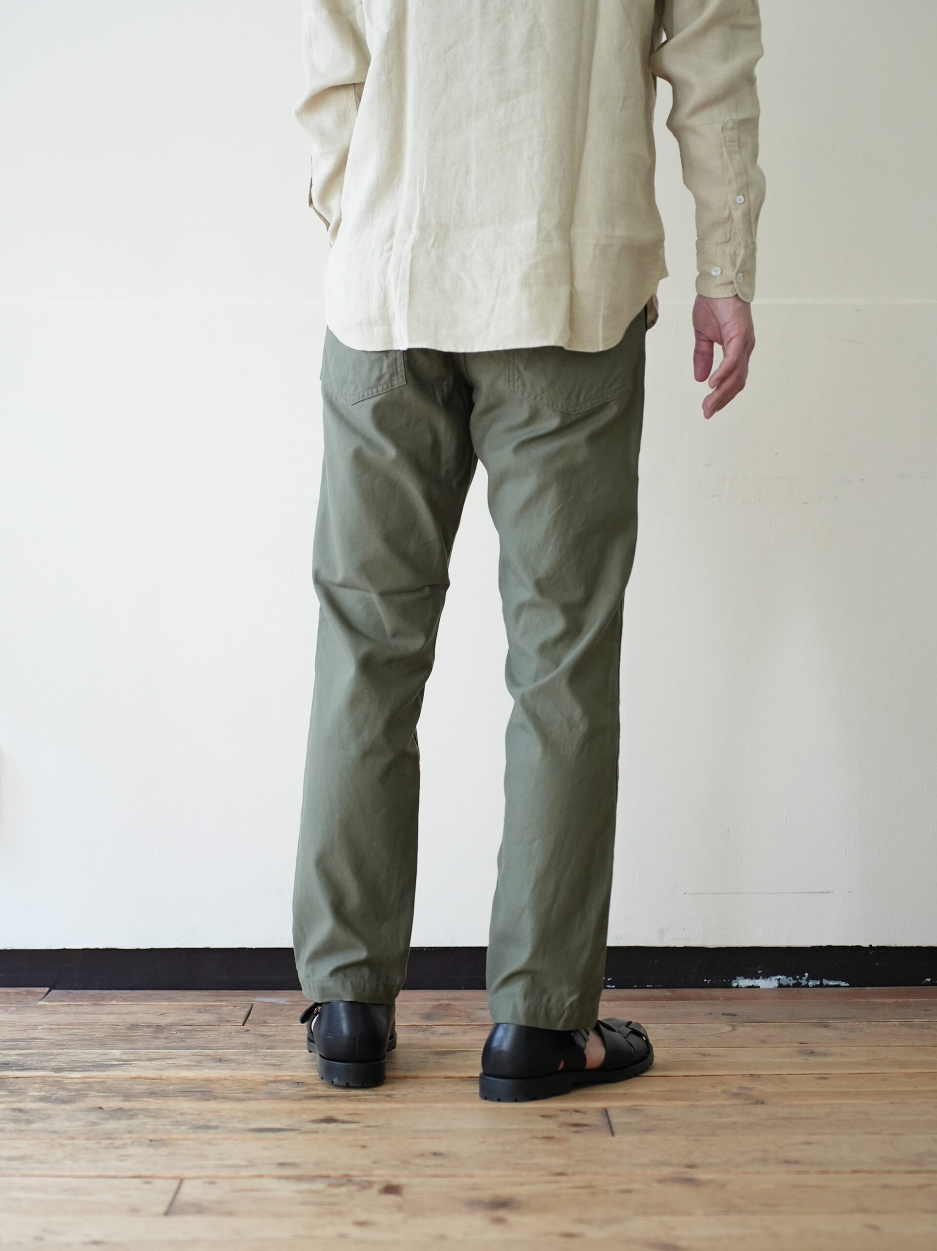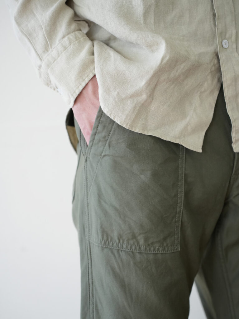 ワークパンツらしい実用的なディティールはそのままに、腰回りは程よくゆとりを持たせ、裾にかけて自然にテーパードした美しいシルエット。