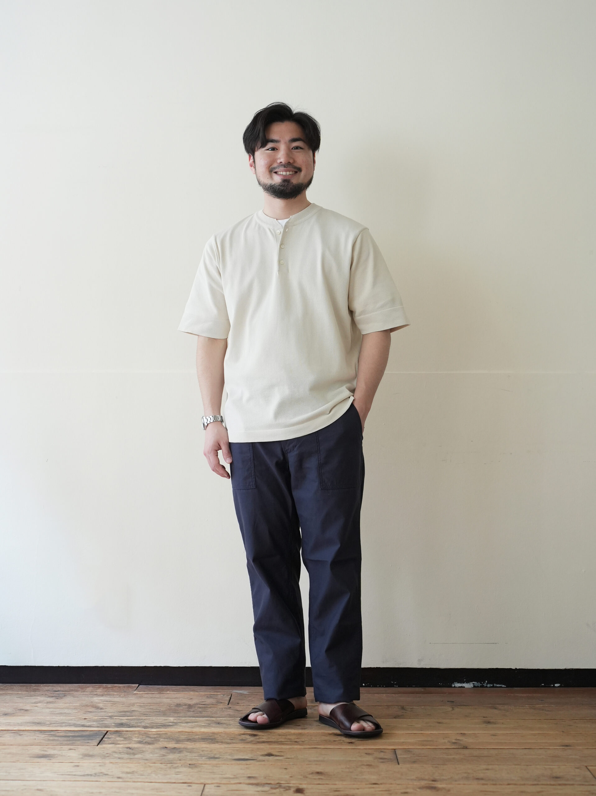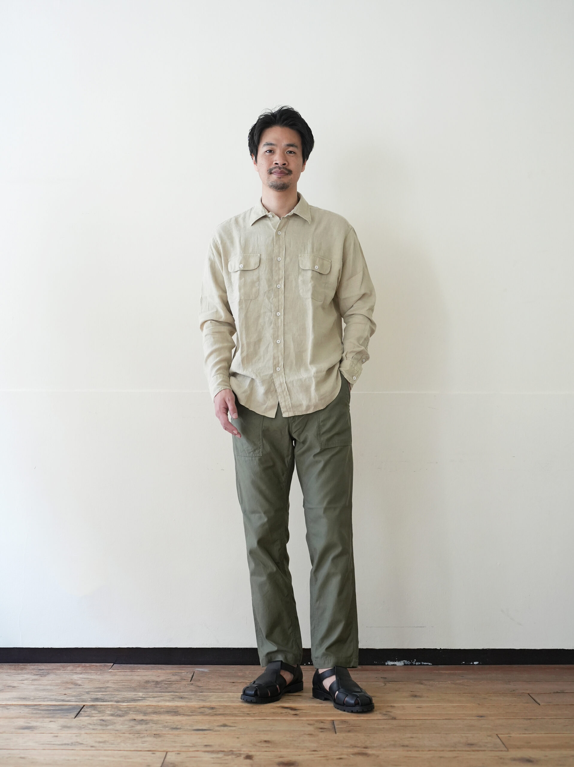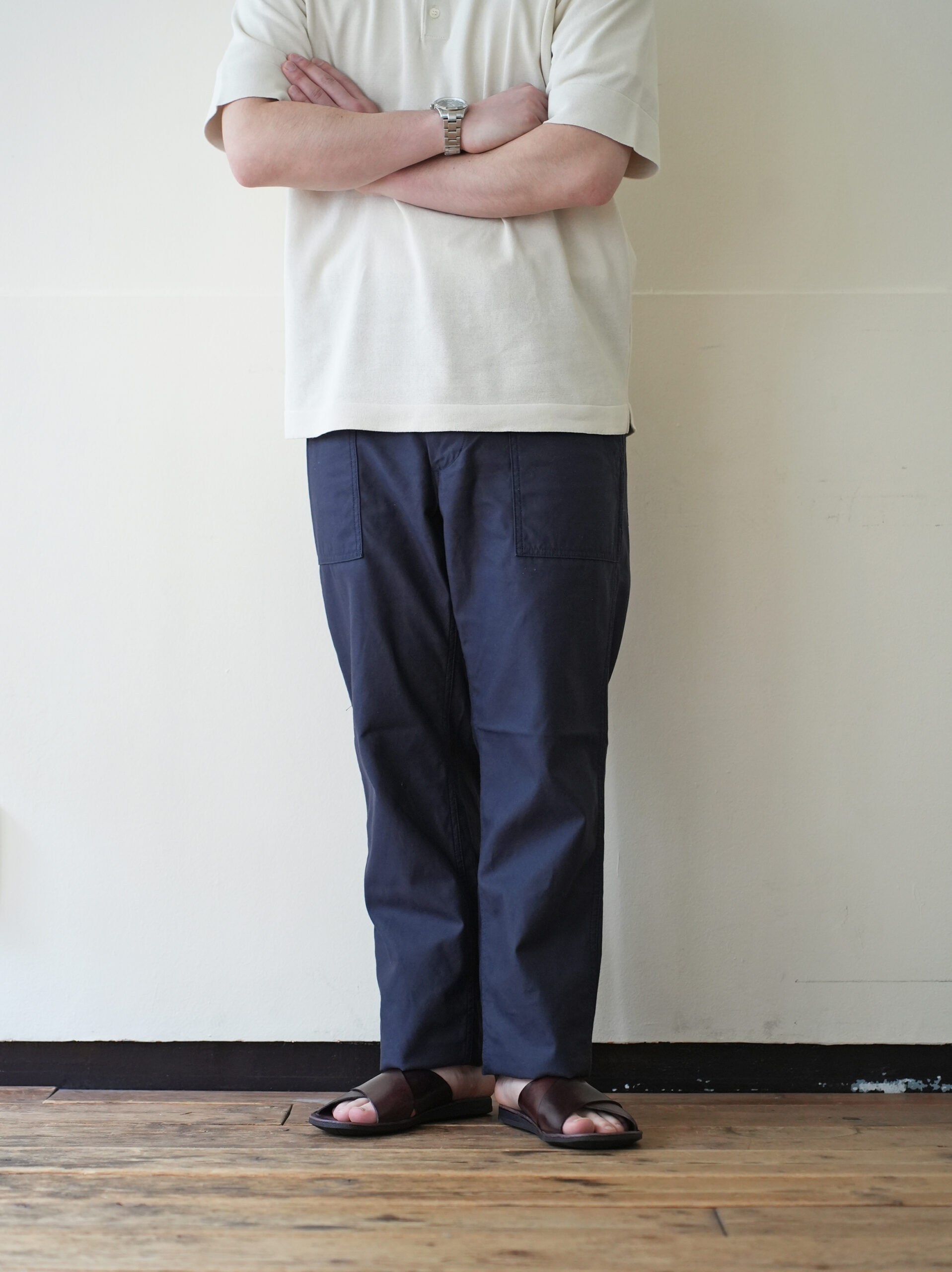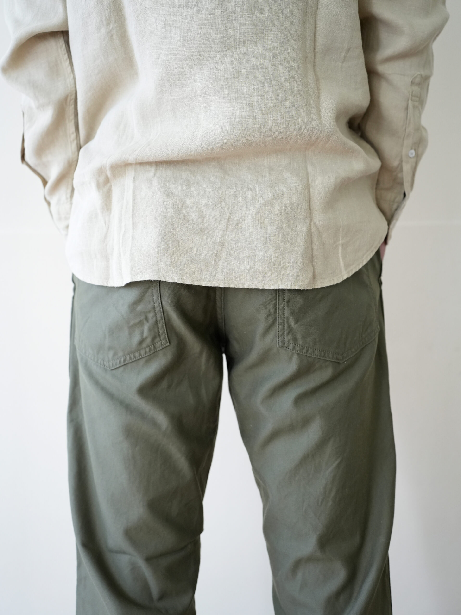 ワークパンツらしい実用的なディティールはそのままに、腰回りは程よくゆとりを持たせ、裾にかけて自然にテーパードした美しいシルエット。