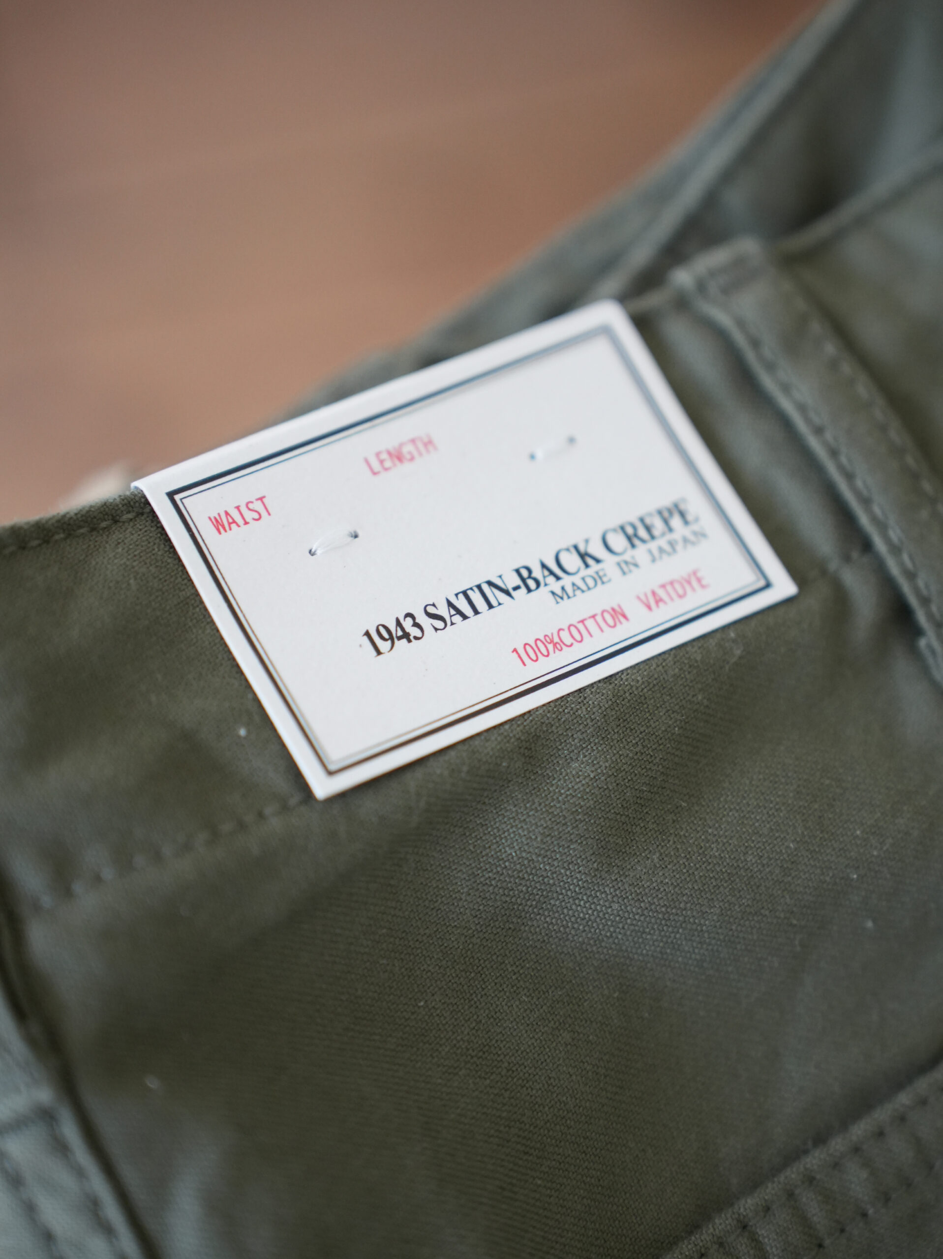 米軍で1940年代に製作されたバックサテンを再開発し、当時のディテールはそのままにシルエットを現代的なテーパードが効いた細身のシルエットに仕上がっているこちら。