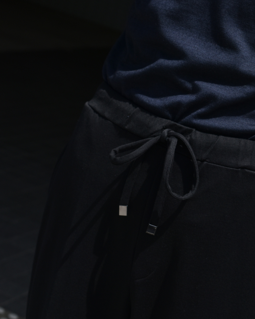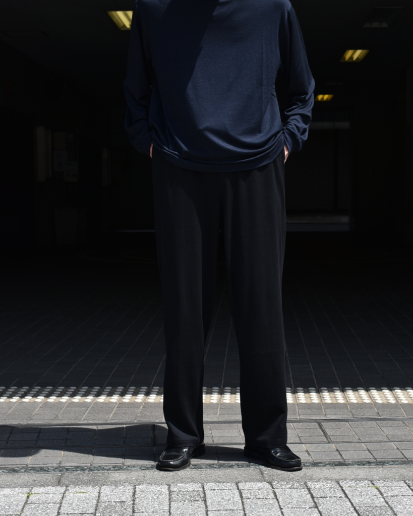 カットソー素材のパンツでありながらスポーティーに寄りすぎず、大人っぽく落ち着いた雰囲気で穿ける一本に仕上がっています。