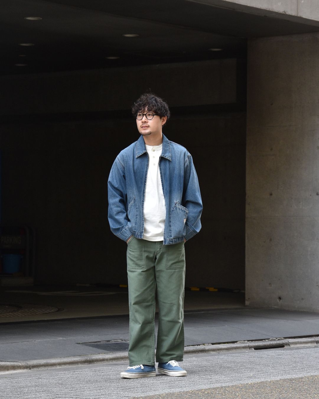 シャンブレーシャツのインナーに。首元も程良く詰まっているのでシャツの下から覗くバランスもバッチリです。