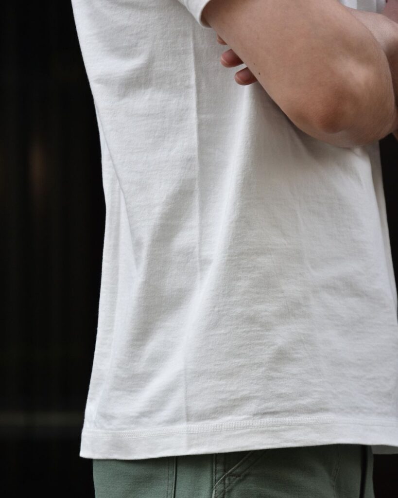 バーンズではそこに通常のTシャツの糸番手よりも太い14番手の糸採用し、さらに度詰めにして編み立てております。