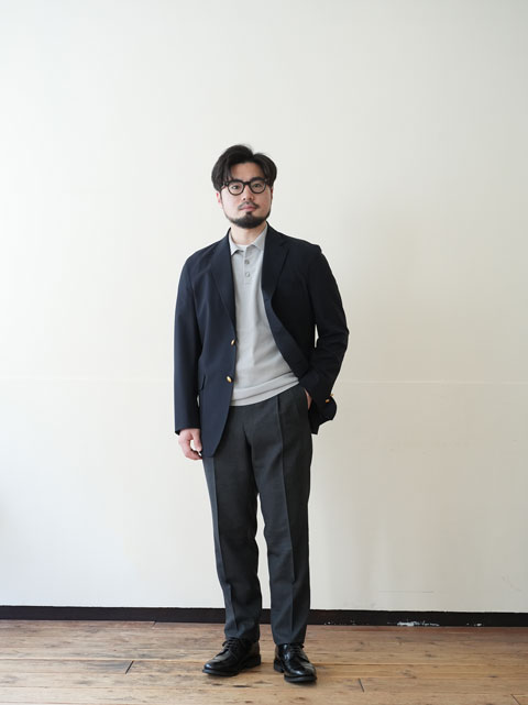 シンプルに紺ブレ×グレートラウザーに中間色となるライトグレーのポロを合わせて。