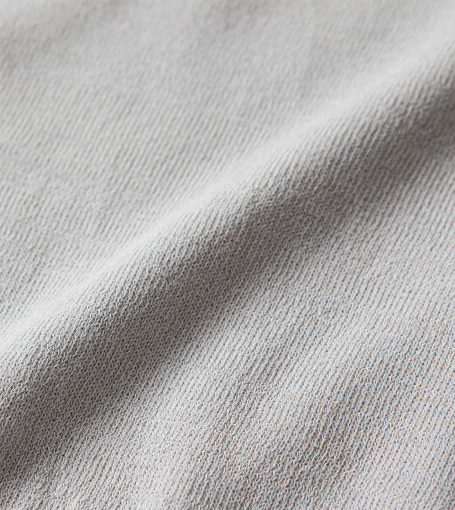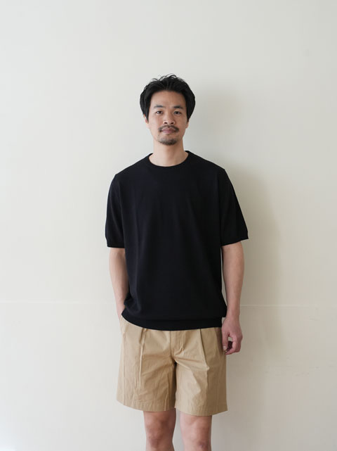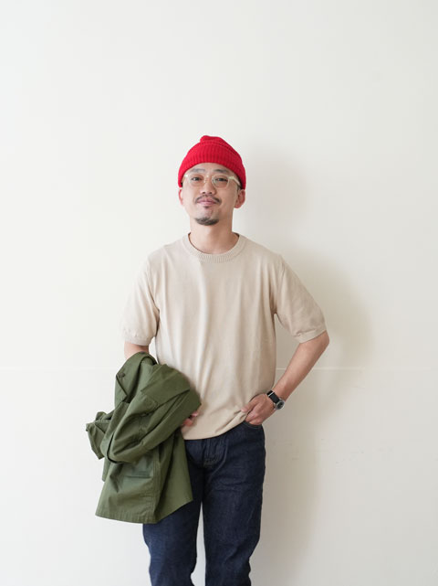 編み組織は12ゲージの天竺編み。目を詰めて編み上げることで上品な雰囲気を纏っています。細番手のアイスコットンを4本取りし、しっかりとしつつもしなやかな生地感に仕上げました。最適な素材選定と、長年培われてきた技術をもってして生まれる「シャリ感」こそが、このアイテムの最大の魅力と言えます。その快適な着心地はブランド創設から現在に至るまで、世界中の人々に選ばれ続けています。