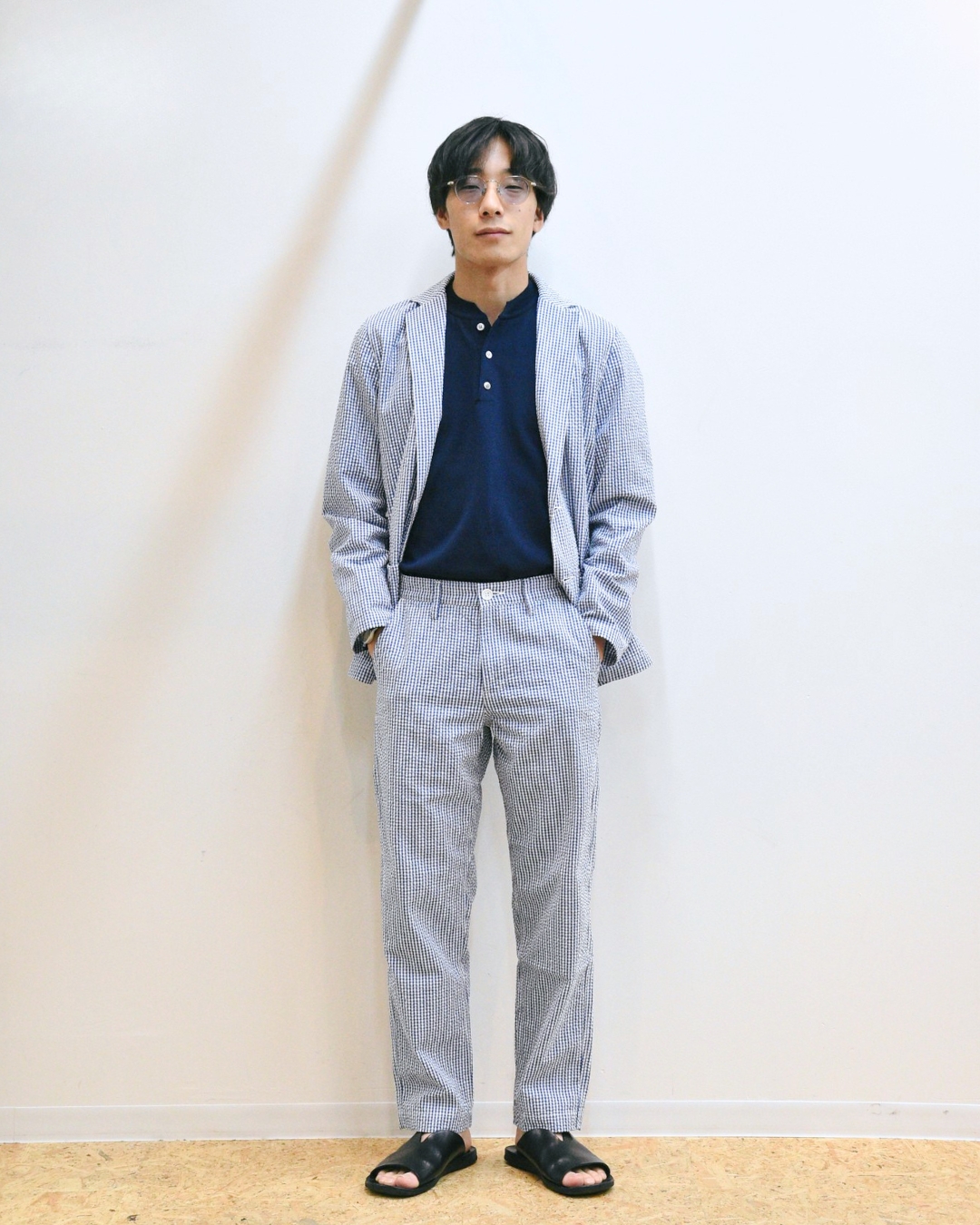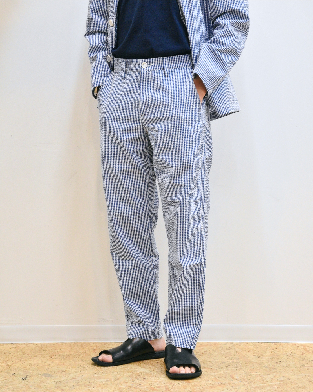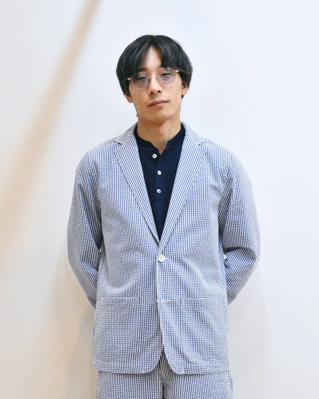 明るいブルーのシアサッカーはクラシックな見え方をしてカッコ良いですね。