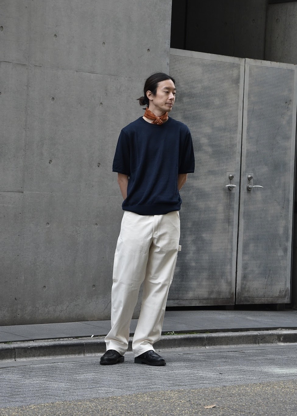 白いパンツと合わせたクリーンな装いに、首元のオレンジスカーフがアクセントとして効いています。