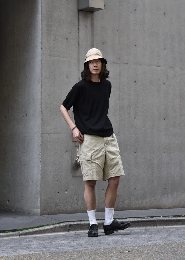 ベージュのバケットハットとハーフパンツを合わせることで、重たくなりすぎず、軽快なバランスに。