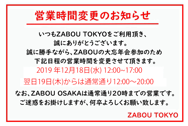 2019.12.14#Blog12/18(水)営業時間変更のお知らせ。(東京店) -